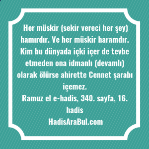 Hadis Metni: Her müskir (sekir vereci her şey) hamırdır. Ve her müskir haramdır. Kim bu dünyada içki içer de tevbe etmeden ona idmanlı (devamlı) olarak ölürse ahirette Cennet şarabı içemez.