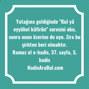 Hadis Metni: Yatağına geldiğinde "Kul yâ eyyühel kâfirûn" suresini oku, sonra onun üzerine de uyu. Zira bu şirkten beri olmaktır.