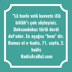 Hadis Metni: "Lâ havle velâ kuvvete illâ billâh"ı çok söyleyiniz. Doksandokuz türlü derdi def'eder. En aşağısı "hem" dir.