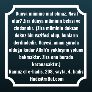 Hadis Metni: Dünya mümine mal olmaz. Nasıl olur? Zira dünya müminin belası ve zindanıdır. (Zira müminin doksan dokuz bin vazifesi olup, bunların derdindedir. Gayesi, aman şurada olduğu kadar Allah'a yaklaşma yoluna bakmaktır. Zira onu burada kazanacaktır.)